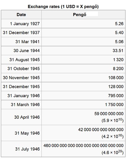 Yep. You're reading the chart correctly. On July 31, 1946, $1 USD was equivalent to approximately 460,000,000,000,000,000,000,000,000,000 pengős! The Hungarian currency was experiencing hyperinflation the likes of which the world had never seen before and has not seen since. In response, the Hungarian government started printing out banknotes of higher and higher denominations.
